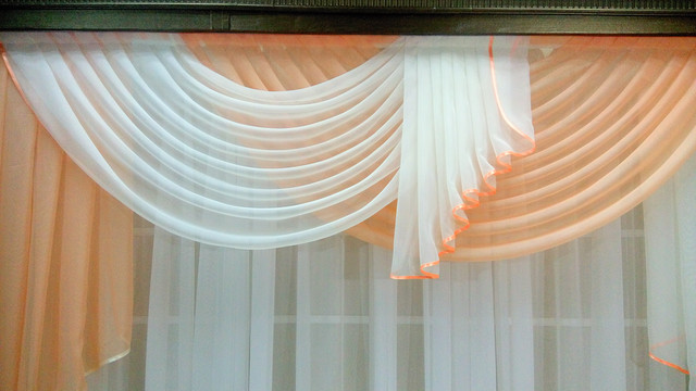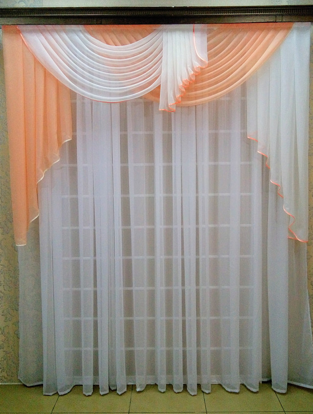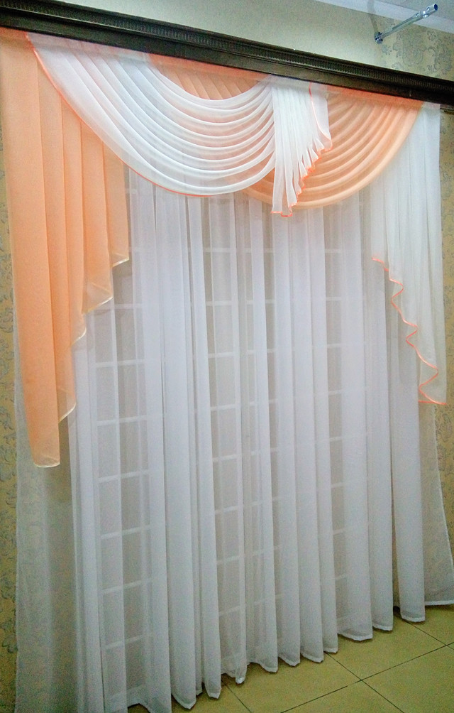 Ламбрекен пошитий із двох кольорів Вуалі (шторного шифону), Персикового кольору й білого кольору, всі краї оброблені косою бейкою, до ламбрикену пришита шторна тасьма, що неабияк полегшує його навішування на карниз. Має дуже оригінальний та красивий вигляд, не перевантажує інтер'єр, легкий, повітряний.
