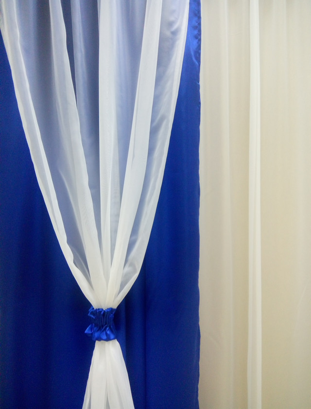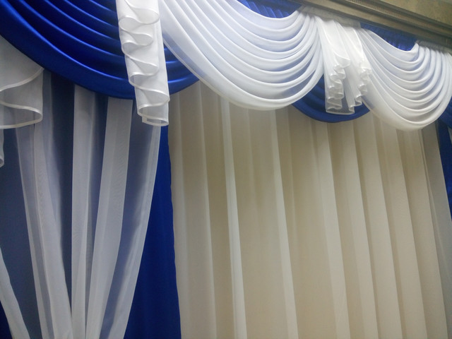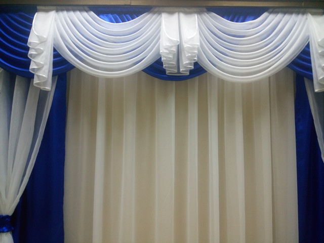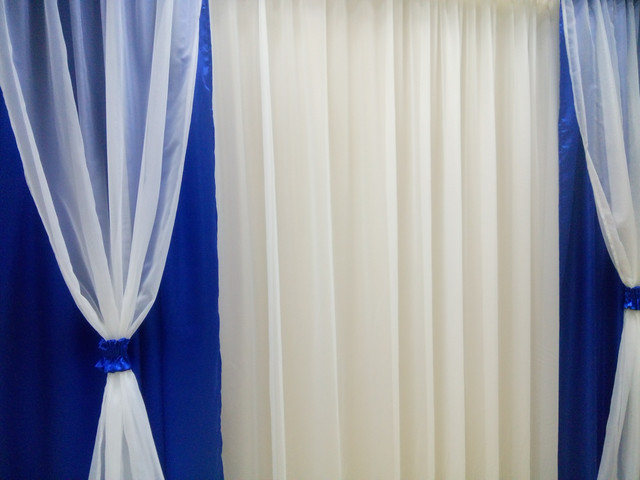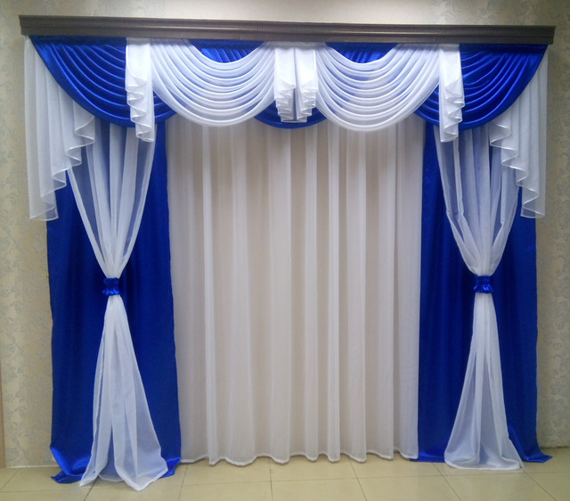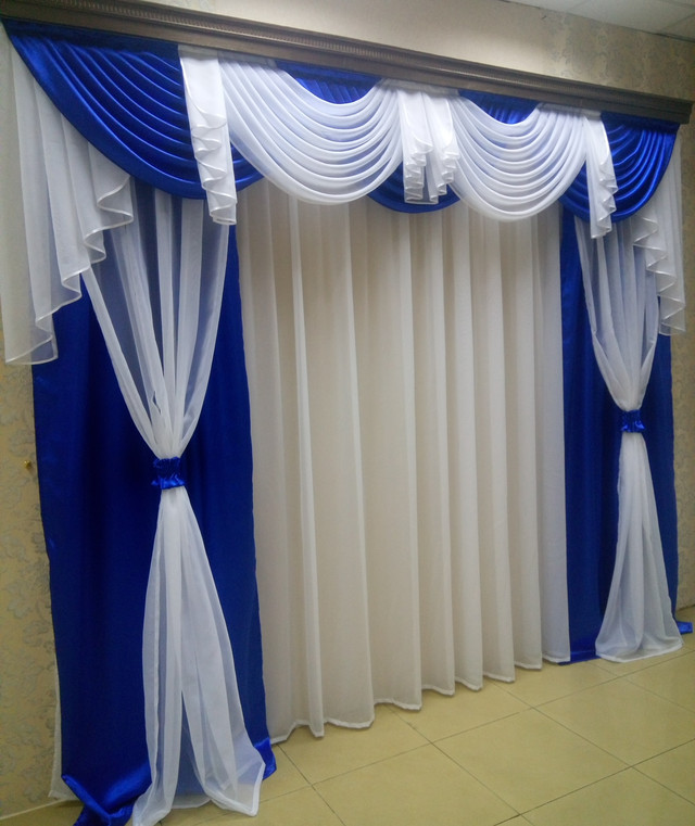 Комплект штор "Посейдон" зшиється з однотонного атласу та однотонної вуалі. Ширина штор з атласу 3 метри, ширина штор із вуалі 3 метри, ширина ламбрекену 3 метри. Комплект штор "Посейдон" доповнений вуаллю.